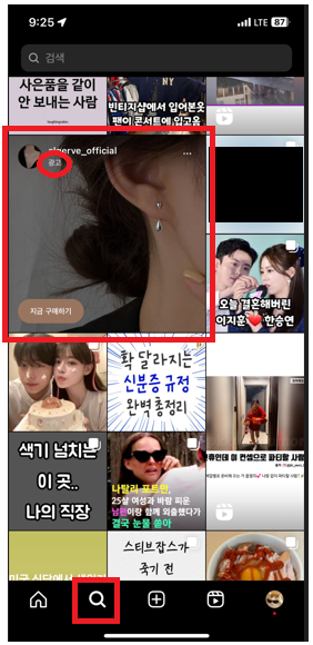 탐색탭에 노출되는 광고인데요, 탐색탭에는 사용자와 관련성 높은 콘텐츠가 표시됩니다.