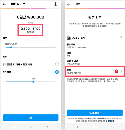 1일부터 30일까지 선택 가능하고 금액도 조절하실 수 있는데요, 예산과 노출기간을 목적에 따라 설정하시면 됩니다.