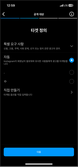 아직 구체적인 타겟이 없으시다면 내 계정의 팔로워와 유사한 사람들을 자동으로 타겟팅 해주는 자동으로 선택해주시면 됩니다.