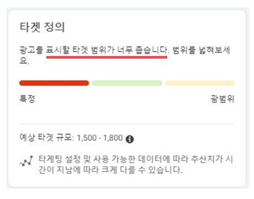예산이 없다고 처음부터 타겟을 좁게 설정하면 이렇게 타겟규모가 너무 적어져서 노출이 잘 안될 수 있습니다..