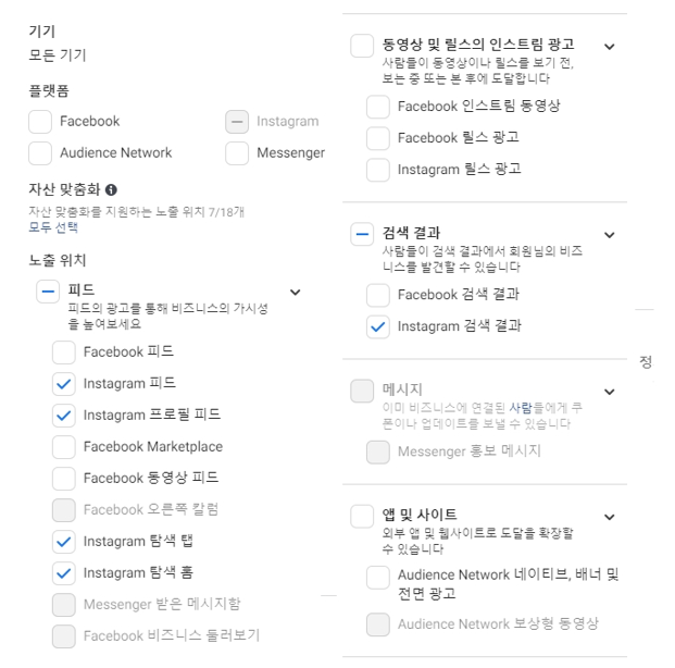 페이스북, 인스타 둘 다 혹은 한군데만 선택해서 노출할 수 있구요, 피드, 스토리, 릴스, 탐색탭 등 세부적인 지면도 선택할 수 있습니다!