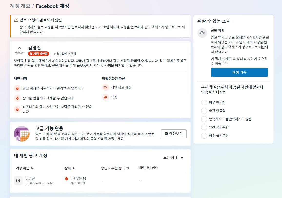 페이스북 안내에 따라 취할 수 있는 조치란에 신원확인을 진행하면 페이지가 접속되지 않는 상태입니다! 페이스북 고객센터도 도움이 안되고 이것저것 찾아보다가 문의 드립니다. 금액을 지불해서라도 해결하고 싶은 마음이라서요.