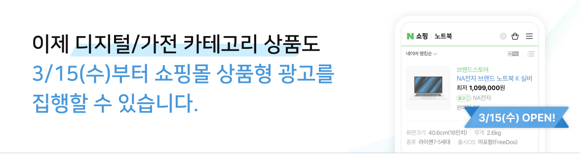 [3/15(수)부터 쇼핑검색광고 쇼핑몰상품형 노출 카테고리가 ‘디지털/가전’ 카테고리 전체로 확대될 예정입니다.