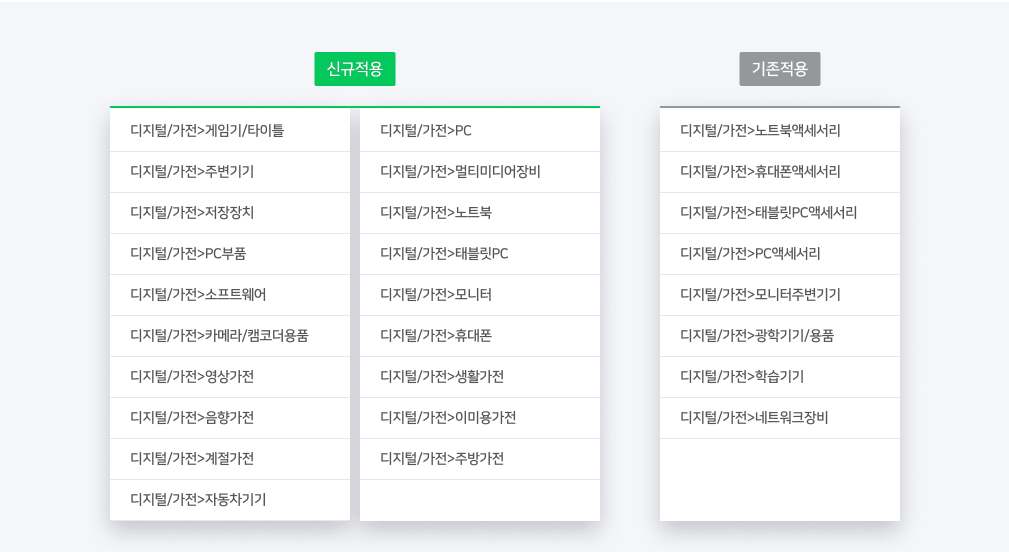 적용 내용은 아래의 디지렅/가전 하위 중분류 카테고리의 상품 등록 시, 쇼핑검색광고 쇼핑몰 상품형 광고 노출 반영에 해당합니다.