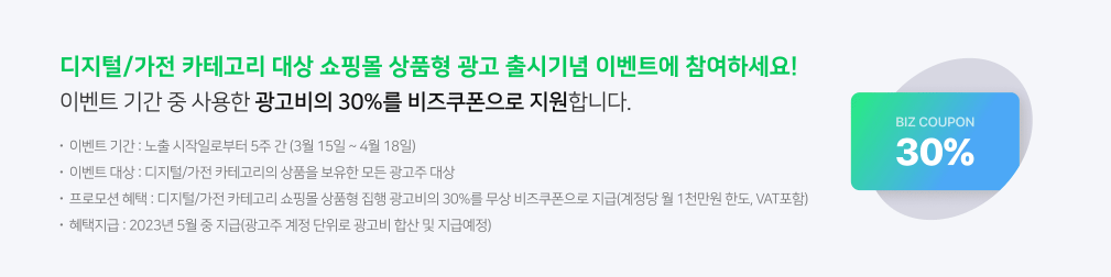 또한 네이버는 디지털/가전 카테고리 대상 쇼핑몰 상품형 광고 출시기념 이벤트도 오픈 하였습니다.
