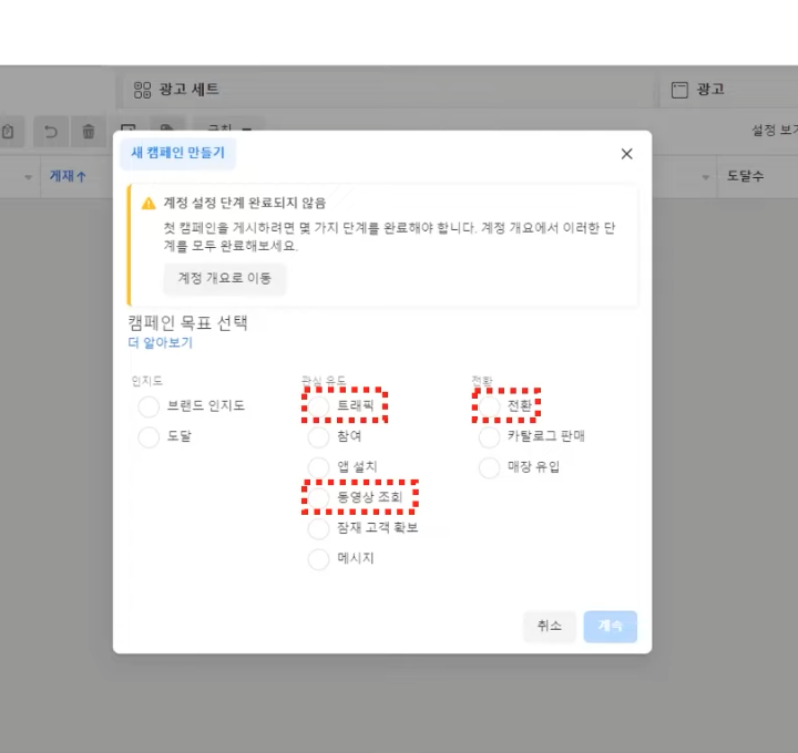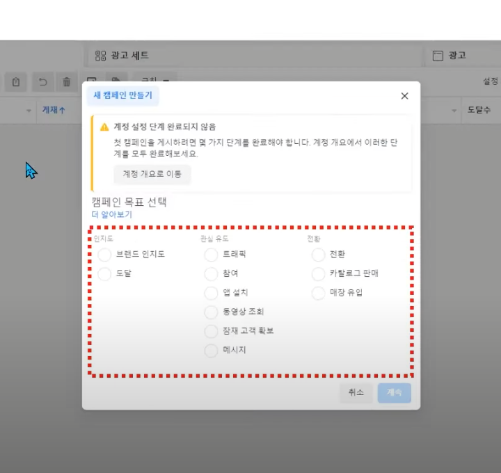 캠페인 목표 선택 탭을 보시면 큰 카테고리로 인지도, 관심유도, 전환이 있는데