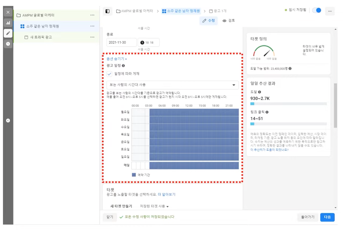 그 아래 옵션 더보기버튼을 누르게 되면 보는 사람의 특정 시간대에 따라서 광고를 진행할 수 있습니다.
