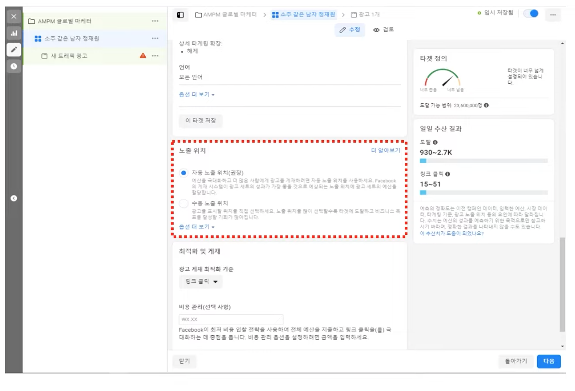 새 타켓만들기에서는 위치, 연령, 성별, 상세 타겟팅만 신경 써주시면 됩니다.
