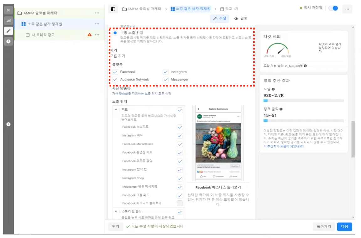 만약에 수동 노출을 선택하게 된다면 audience network와 messenger 는 광고가 많이 보여지지 않기 때문에