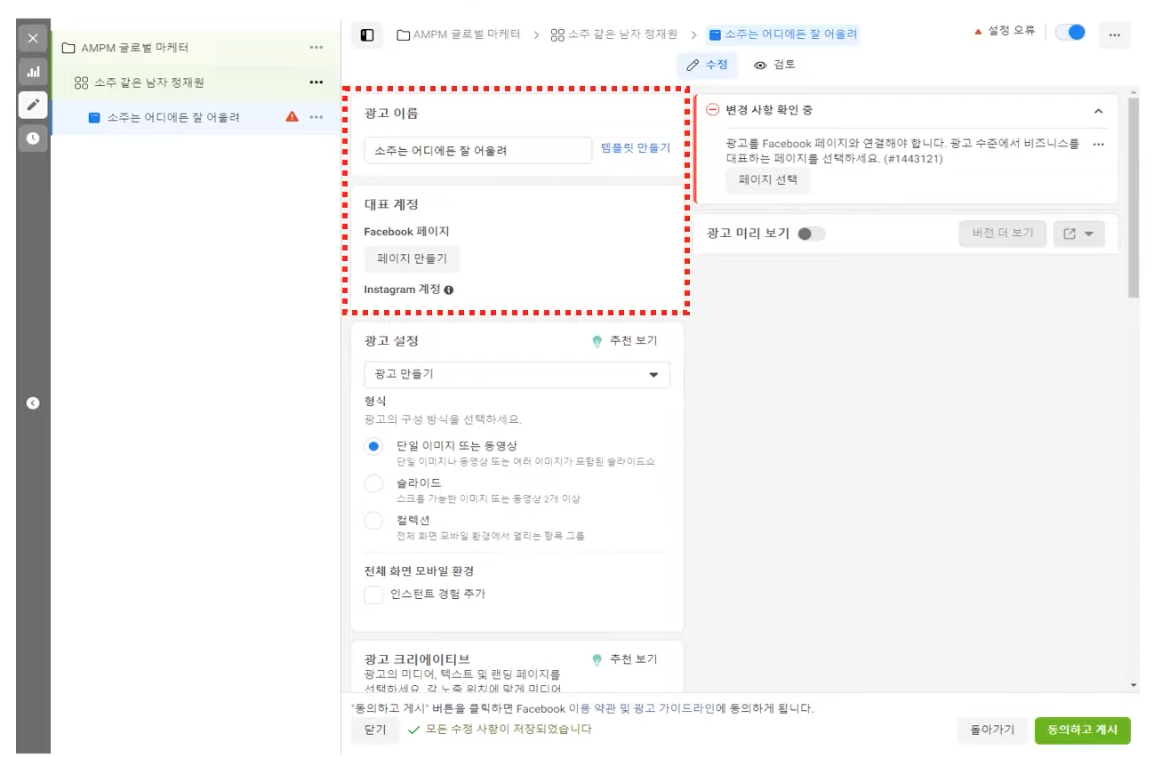 먼저 광고 이름은 제품에 알맞게 혹은 광고 소재에 알맞게 적어 주셔야 나중에 구분하기가 쉽습니다.