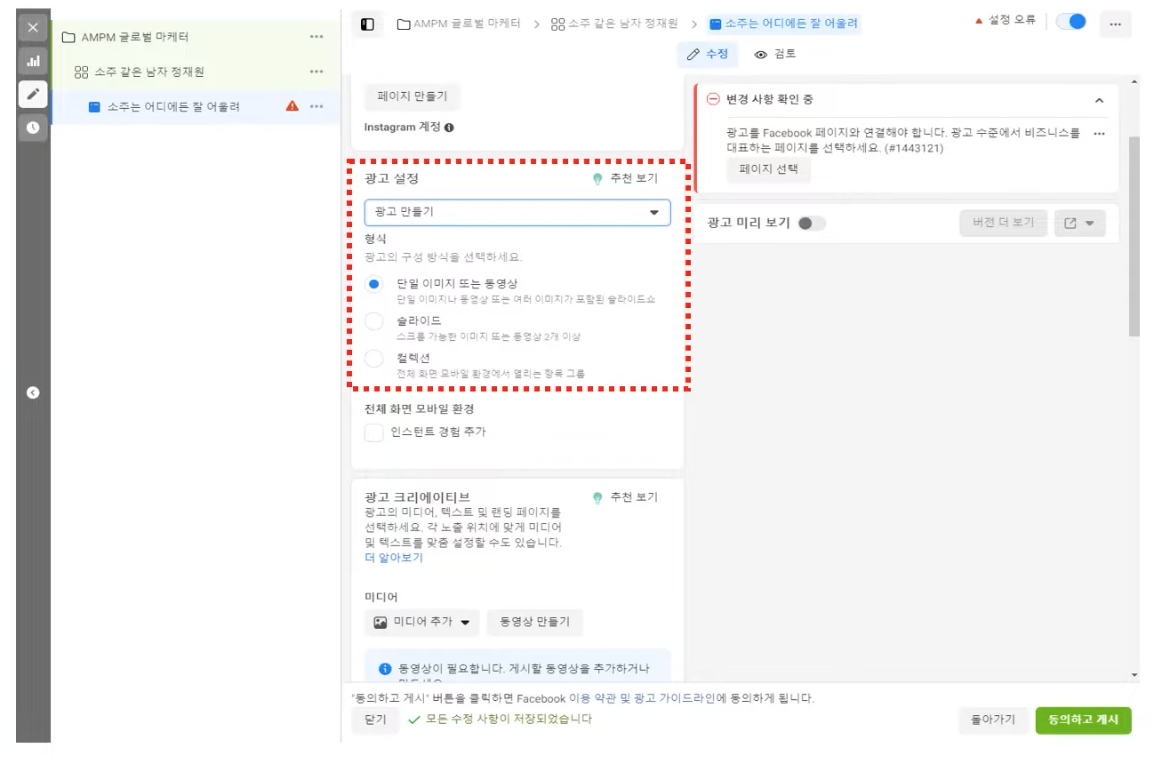 저의 경우는 단일이미지 동영상을 선택해서 다음과 같이 광고 소재를 넣었습니다.