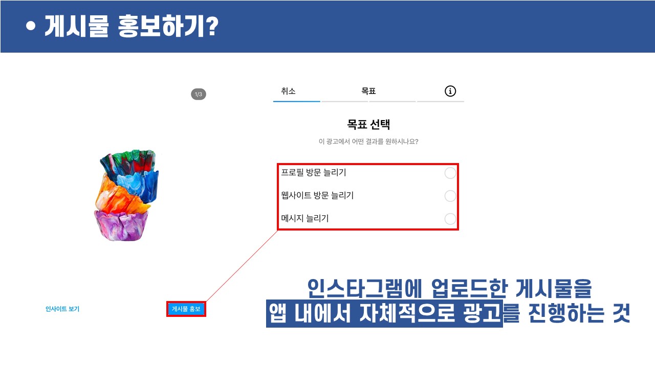 인스타그램 피드에 업로드한 게시물을 앱내에서 자체적으로 광고를 진행하는 것을 말합니다.