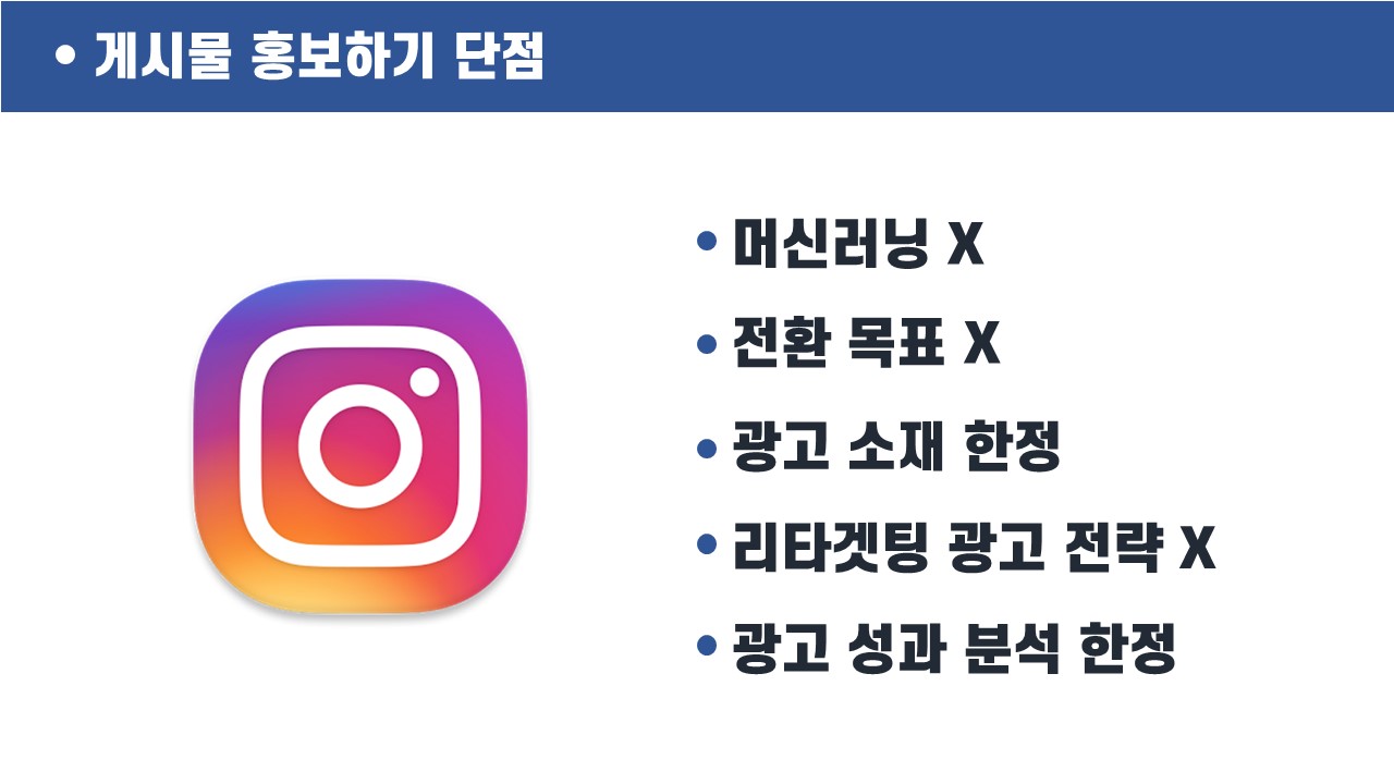 먼저 인스타그램 광고의 최대 장점인 머신러닝 기능을 활용하지 못하기때문입니다.