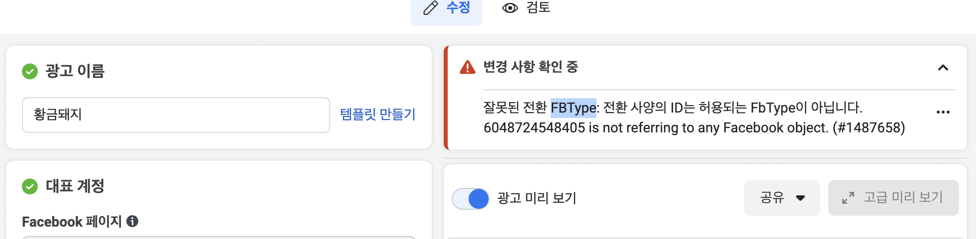 제가 광고를 만들려고 하니 잘못된 전환 FBType라고 하며 오류가 떠요ㅠㅠ(#1487658) 전환 사양의 ID는 허용되는 FBType이 아니라고 하는데 이게 뭐죵...?