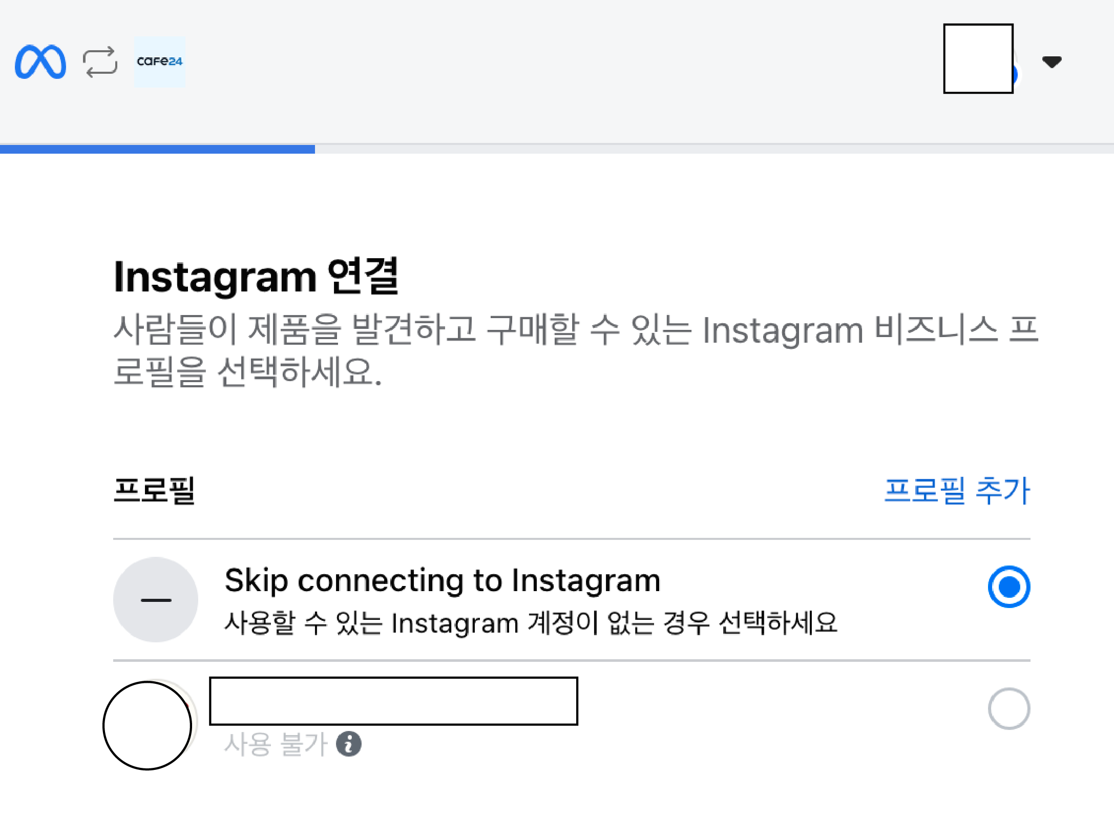 사진에서 나와있는것과 같이 카페24를 통해 페이스북 픽셀설정 "시작하기"를 눌러 진행하는 중 인스타그램 연결이 오류가 나서 그 앞으로 진행이 안되고 있습니다!